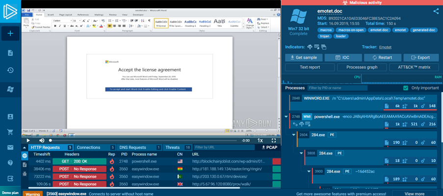 Dobrym przykładem jest pokazowa analiza niebezpiecznego oprogramowania Emotet, które jest dostarczane poprzez wiadomość email. Zawiera ona adres URL, który zazwyczaj pobiera plik .doc, zawierający niebezpieczne makro, łączące nas z serwerem C&C(Command and Control) poprzez wykonanie komend w PowerShellu. To właśnie na przykładzie Emoteta postaram się zaprezentować wam narzędzia do analizy.