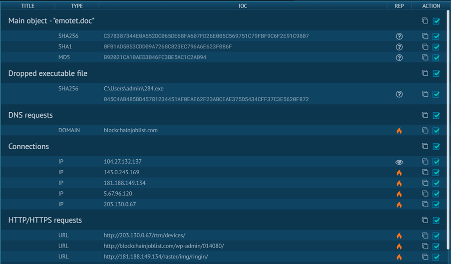 Istotne informacje zawarte są w sekcji IoC, w której dostępne są takie dane jak np.: zapytania DNS, hashe, żądania HTTP/HTTPS czy adresy IP, z jakimi strona/plik się łączy. Pozwala to na głębszą analizę oraz dokładniejsze zrozumienie działania badanego obiektu. Otrzymujemy powiązane IoC (Indicators of Compromise), które można zweryfikować również w innych witrynach. Poniżej widzimy sekcję IoC dla powyższej przeprowadzonej analizy Emotet.