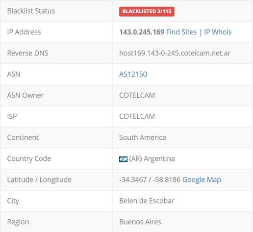 Pójdźmy o krok dalej i spróbujmy się dowiedzieć czegoś więcej o uzyskanych w sekcji IoC adresach IP oraz domenach. W tym celu użyjemy dwóch ogólnodostępnych baz adresów IP, a mianowicie: AbuseIPDB oraz IPVoid. Pierwszy z nich to baza, w której webmasterzy, administratorzy systemów oraz inne zainteresowane osoby zgłaszają adresy IP, powiązane z odnotowanymi na nich potencjalnymi cyberatakami. IPVoid, podobnie jak AbuseIPDB, zawiera bazę adresów IP, powiązanych z naruszeniami bezpieczeństwa, ale także umożliwia wykorzystanie innych funkcji takich jak uzyskanie geolokalizacji, czy reverse DNS lookup. Przykładowy wynik dla wybranego adresu IP w bazie IPVoid widoczny jest poniżej.