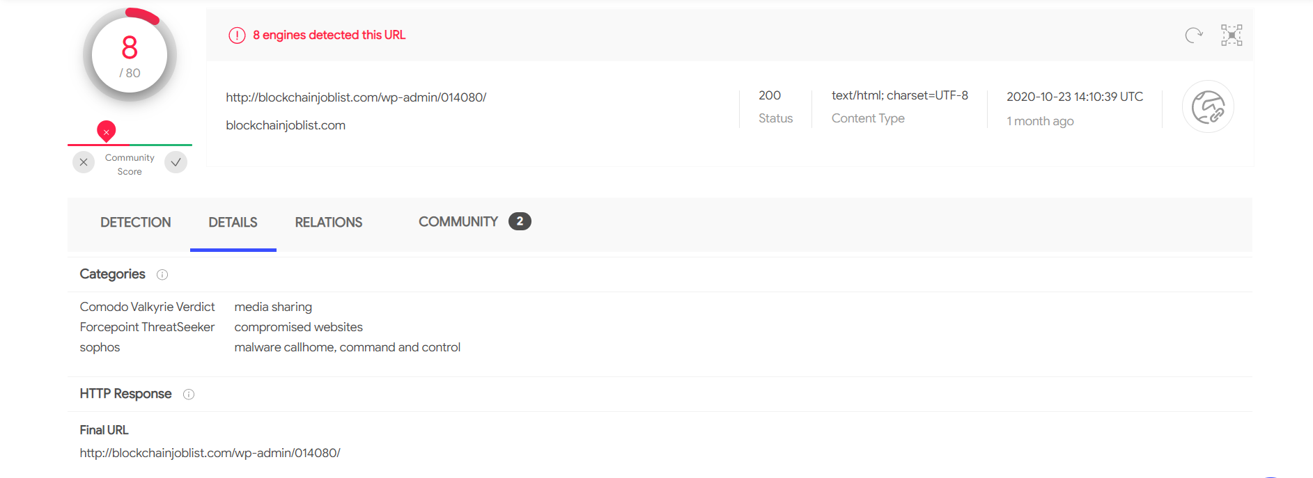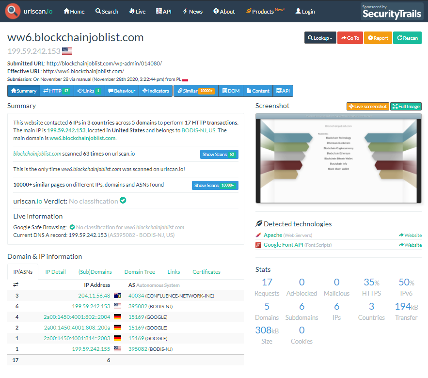 Informacje jakie uzyskaliśmy za pomocą urlscan są znacznie obszerniejsze niż te, które udostępnił na VirusTotal. Przykładowo, nie używając urlscan nie dowiedzielibyśmy się o faktycznym Final URL (Effective URL), który jest rzeczywistym adresem strony, do której doprowadzi nas pierwotny URL (jak pewnie się domyślacie, całkiem cenna informacja)
