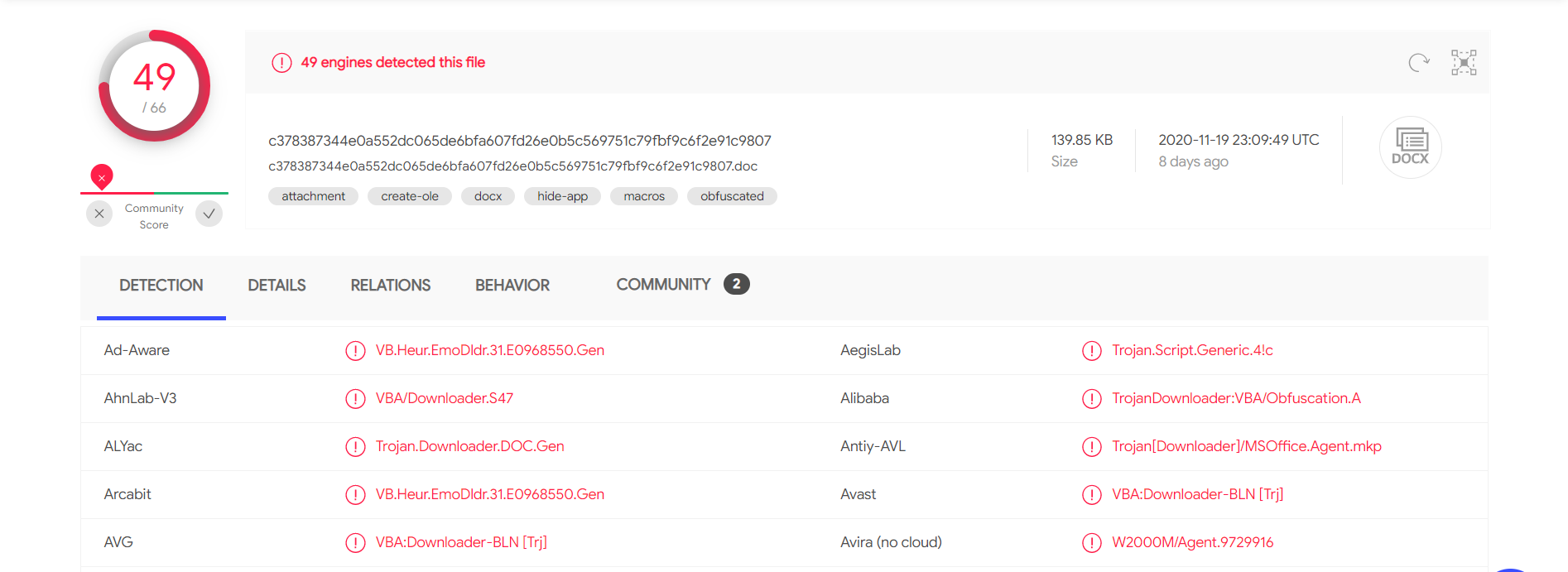 VirusTotal jest znakomitym internetowym skanerem. Posiada on ogromną bazę IoC, która pozwala na zdobycie dużej wiedzy o badanym pliku, linku czy adresie IP. Skorzystajmy z niej i spróbujmy dowiedzieć sie czegoś więcej o analizowanym przypadku. Najpierw sprawdźmy zdobyty hash MD5. Wklejenie go w sekcje SEARCH na VirusTotalu w wyniku da taki oto rezultat: