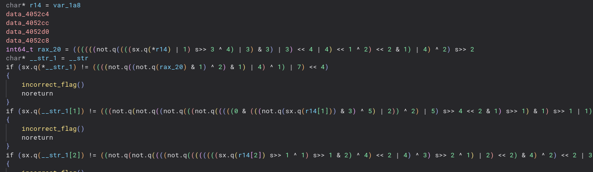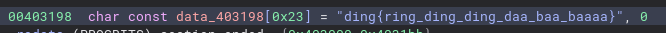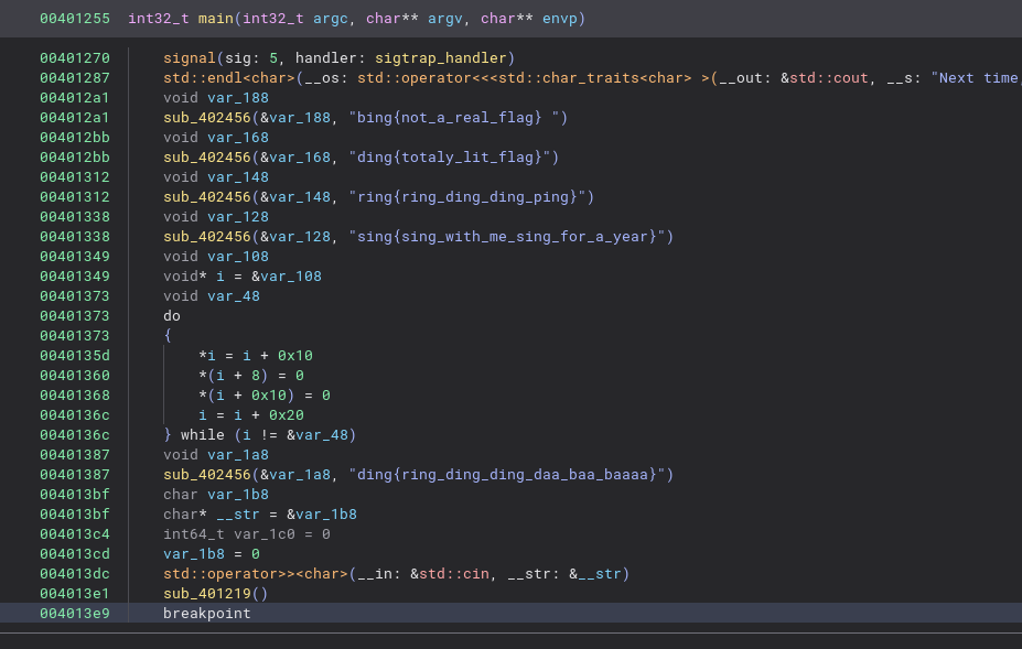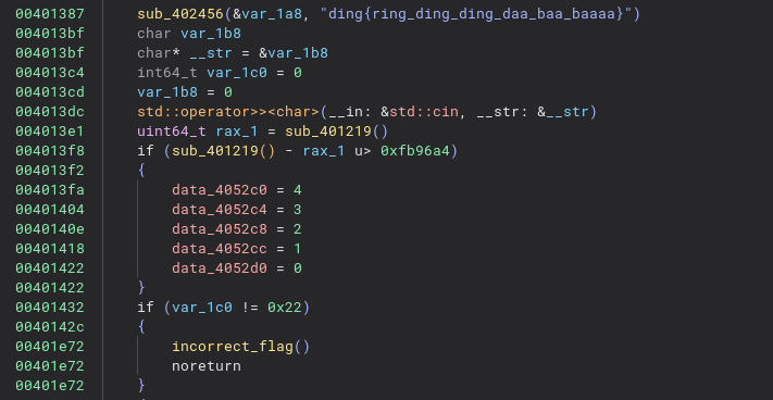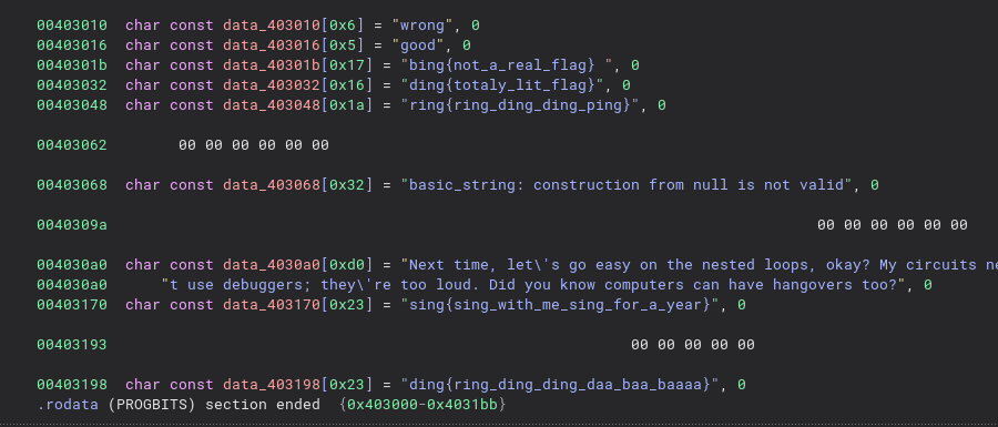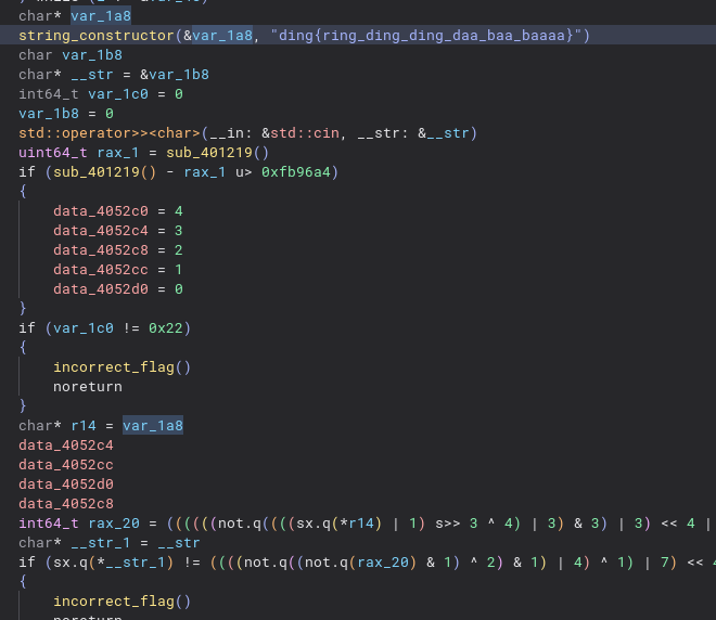 W równaniach została jeszcze jedna zmienna, której wartości Binary Ninja nie zna - r14. Program kopiuje ciąg znaków “ding{ring_ding_ding_daa_baa_baaaa}” do std::string a następnie wskaźnik do skopiowanego ciągu znaków jest przypisywany do r14.