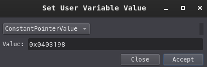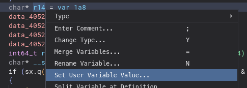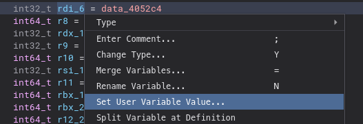 Używając User Informed Data Flow ustawiamy wartości czterech zmiennych lokalnych (rdi_6, rdx_1, r9 i rsi_1). Wartości powinny być takie jak te co zostają ustawione po wywołaniu sigtrap_handler w odpowiedzi na wykonanie instrukcji breakpoint.