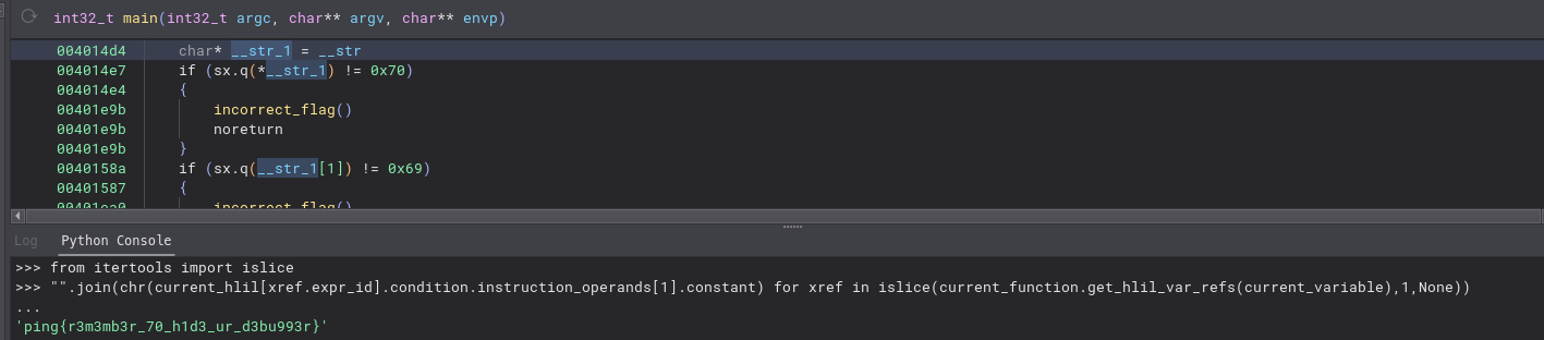 >>> "".join(chr(current_hlil[xref.expr_id].condition.instruction_operands[1].constant) for xref in islice(current_function.get_hlil_var_refs(current_variable),1,None))