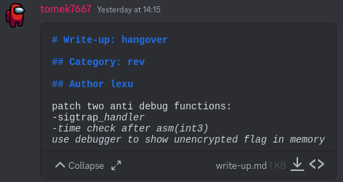 Podczas turnieju pingCTF 2023 zorganizowanego przez Koło Naukowe PING z Politechniki Gdańskiej, rozwiązałem wyzwanie “Hangover” plik.