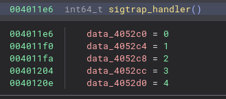 Funkcja sigtrap_handler(ponownie nadajemy funkcji nazwę), ustawia wartości pięciu zmiennych globanych.